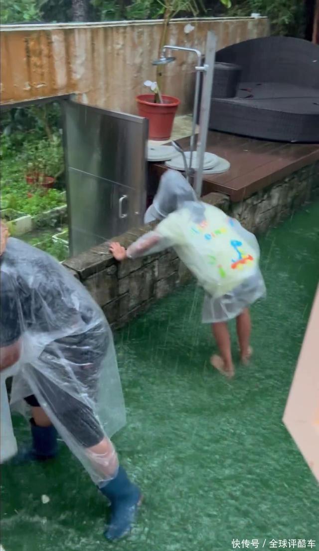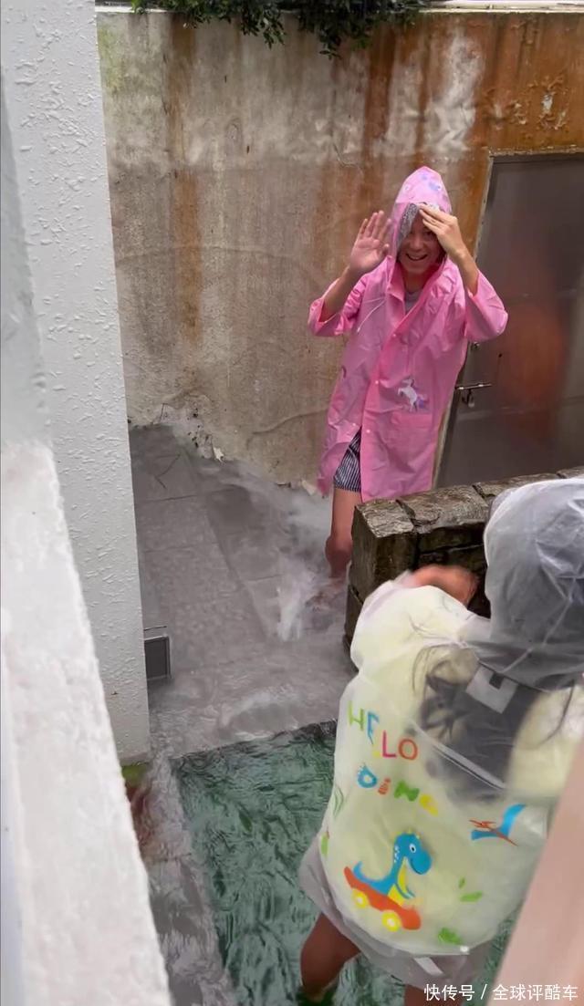 尽管情况不妙,但蒋怡和子女并莫得一脸愁容,反而是一边排水一边嬉戏,小一又友更是乐疯了,站在雨中走动踩水,蒋怡乐在其中,莫得让子女回屋,当妈的心可真大。