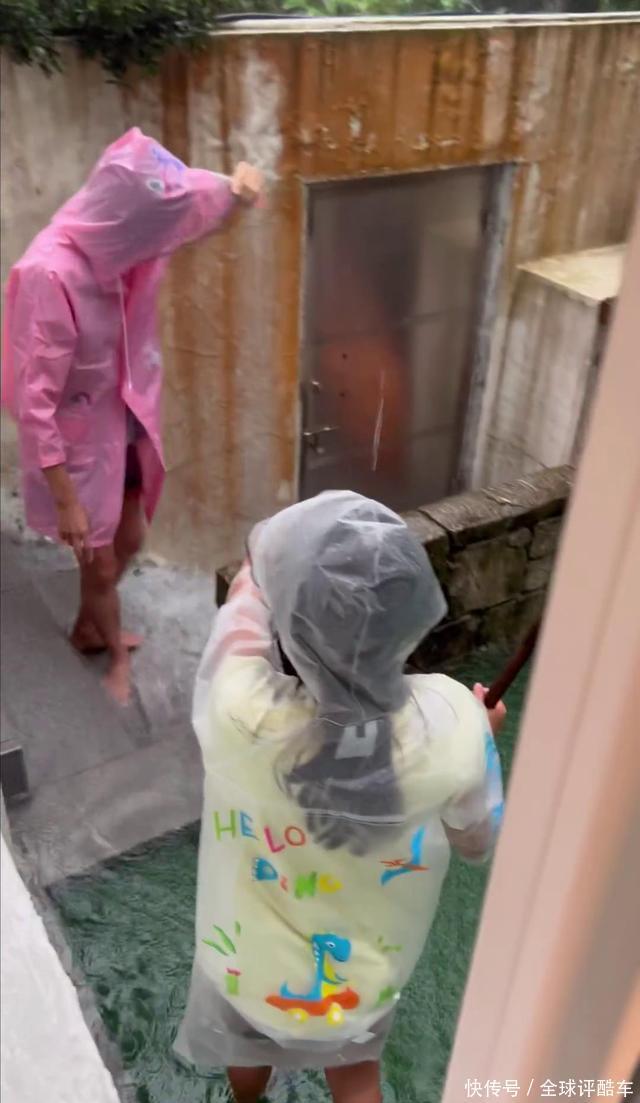 排水最积极的唯有丈夫和佣东谈主,一个在室外一个在室内,蒋怡的丈夫身穿粉色雨衣在户外排水,看到镜头还笑容打呼叫,佣东谈主则在室内卖力排水。